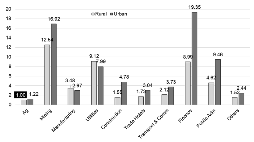 First, in key urban sectors like manufacturing and real estate and other services, the estimated urban value added per worker is lower than that in rural areas (ratio less than one)! This implies that if one moves a manufacturing worker from rural to urban areas, the total value added will actually decline. In real estate and professional services, the much larger share of workers in the sector in urban areas is not matched by a sufficiently increased productivity. Second, relative to value added per work in rural agriculture, all other sectors have much higher value added per worker, whether they are located in the urban area or are part of the rural non-farm sector, i.e., there are substantial gains from moving to non-farm work, even in rural areas. The two findings indicate that urbanization has not been an automatic economic positive.7