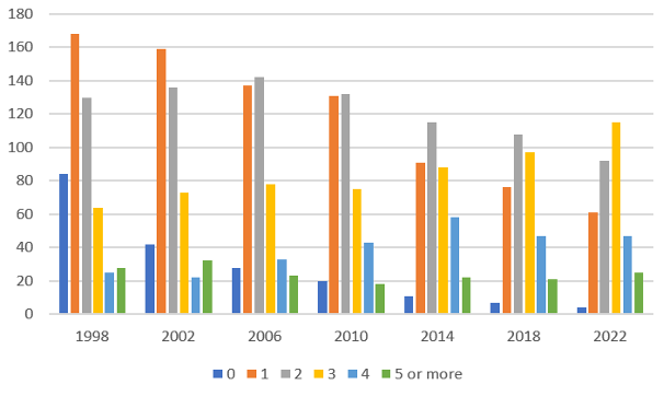 In the Netherlands, the number of local parties that are not registered nationally increased substantially between the 1998 and 2022 elections. Figure 1 shows that on average, the number of local political parties per municipality increased from 1.75 in 1998 to 2.64 in 2022. In 1998, more than 80 Dutch municipalities did not have a local party, while in 2022 this decreased to four. Remarkably, the number of municipalities with three-four local parties increased from 18% in 1998 to almost 50% in 2022 (see the yellow and blue bars, respectively, in Figure 1).